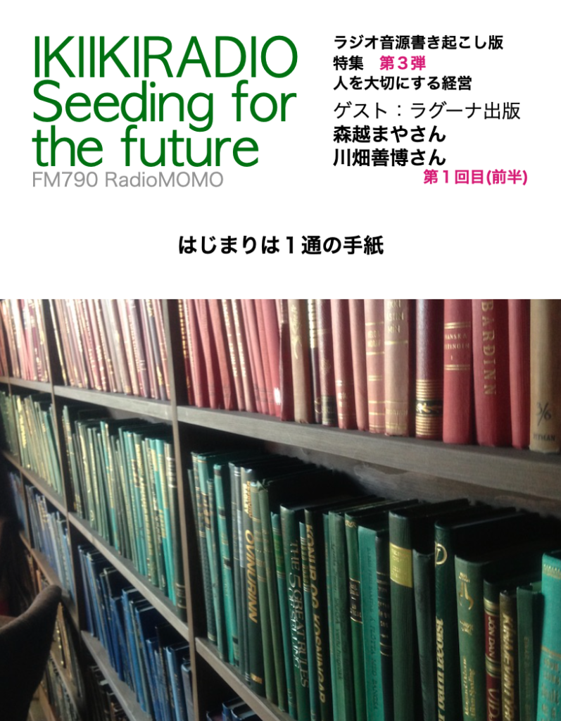 今日お招きしたラグーナ出版さんを、存じ上げるきっかけになったのは、坂本先生です。以前この番組にもたびたびご出演いただきましたけれども、元法政大学の教授で、「人を大切にする経営学会」会長の坂本先生。先生のご著書で有名なのが「日本でいちばん大切にしたい会社」シリーズですが、その3冊目でラグーナ出版さんを取り上げられたんです。そして、この本は、僕の人生を変えた本なんです。以前も申し上げましたが、セリオという会社の社長さんが亡くなって、たまたまその後を僕が引き継ぐことになってしまったんですけど、その時にいろいろなしんどいことやトラブルがありまして、これからどうやったらいいんだろうと思ってる時に、ちょうど出たのがこの本で、この本を読んだ時にですね、自分は、なんか今、とんでもない難題が降りかかってきて悩んでるけれども、世の中にはそれどころじゃない苦難や困難に立ち向かった人がいらっしゃるなということをこの本で知って、すごく勇気づけられたんです・・。