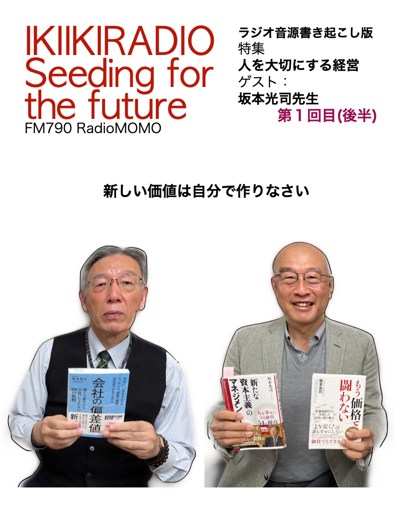 これは問題だと思ってですね、ここがね、僕は「100年企業を考える」未来への種まきというテーマを、この番組につけさせていただいた最大の理由は実はここなんです。100年企業を考えるんだったら、今最もしなきゃいけない未来への種まきは、まず経営者が、自分の信念として、この正しい経営とは何かということをどっかの本に書いてあったとか誰が言ったとかじゃなくて本当に自分の信念として何を持つかだろうと。ということで少しでもこの場を借りて坂本先生から教えていただいたことを広げていきたい、伝えていきたいなと。