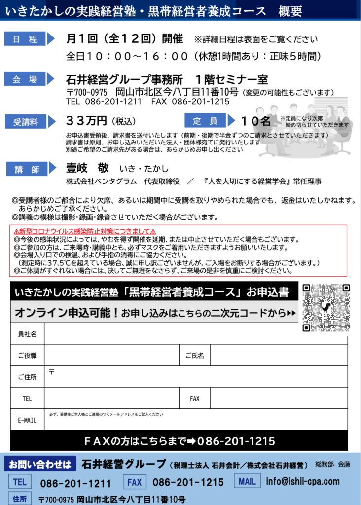 (*黒帯経営塾要点コース(養成コース卒業者による実践編クラス)については中途募集をしておりません。