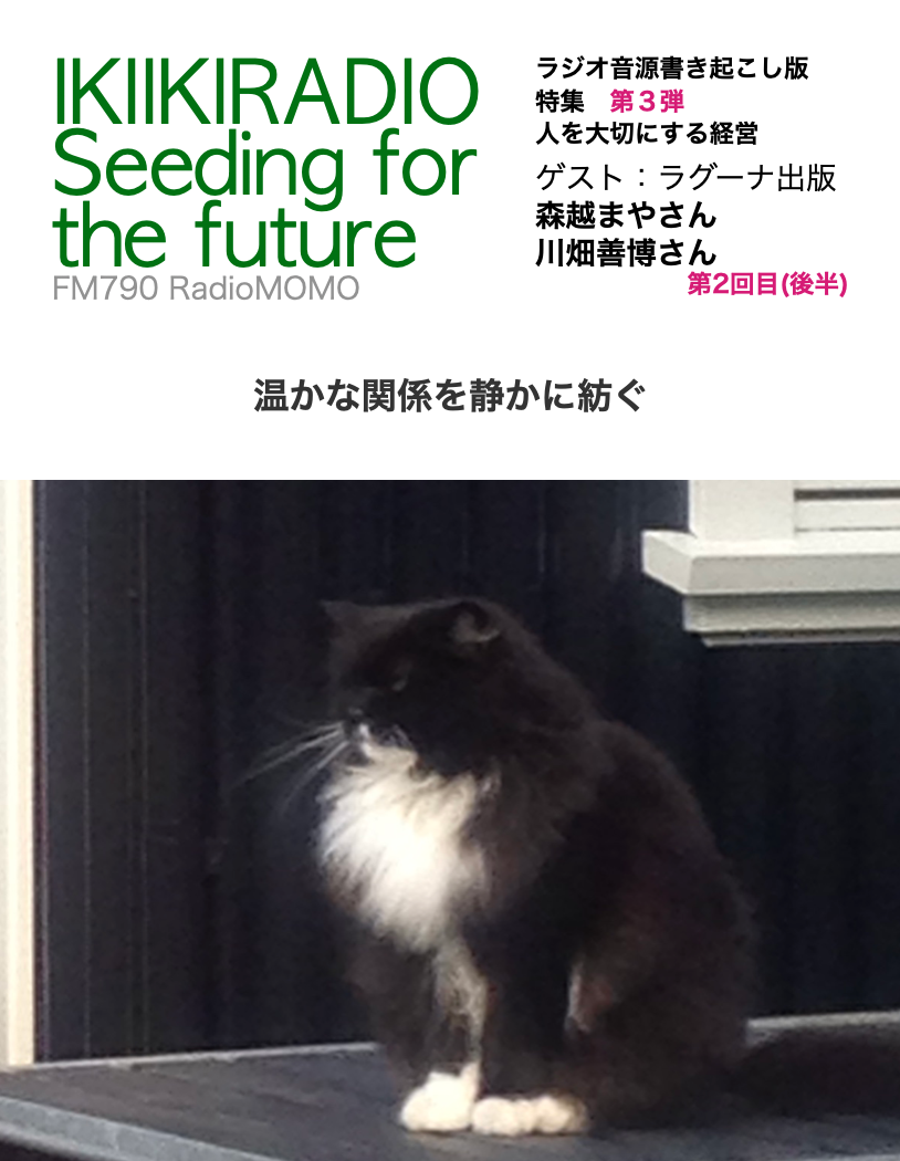 宮田:なるほど。これが社会の中で働きながら治療してくというか。という形なんですね・・。ということで、今日は株式会社ラグーナ出版・代表取締役会長、森越まやさん。そして同じくラグーナ出版・代表取締役社長、川畑善博さんにお話をお聞きしましたが、次回もお二人、もう一回お付き合いいただきますので、よろしくお願いいたします。